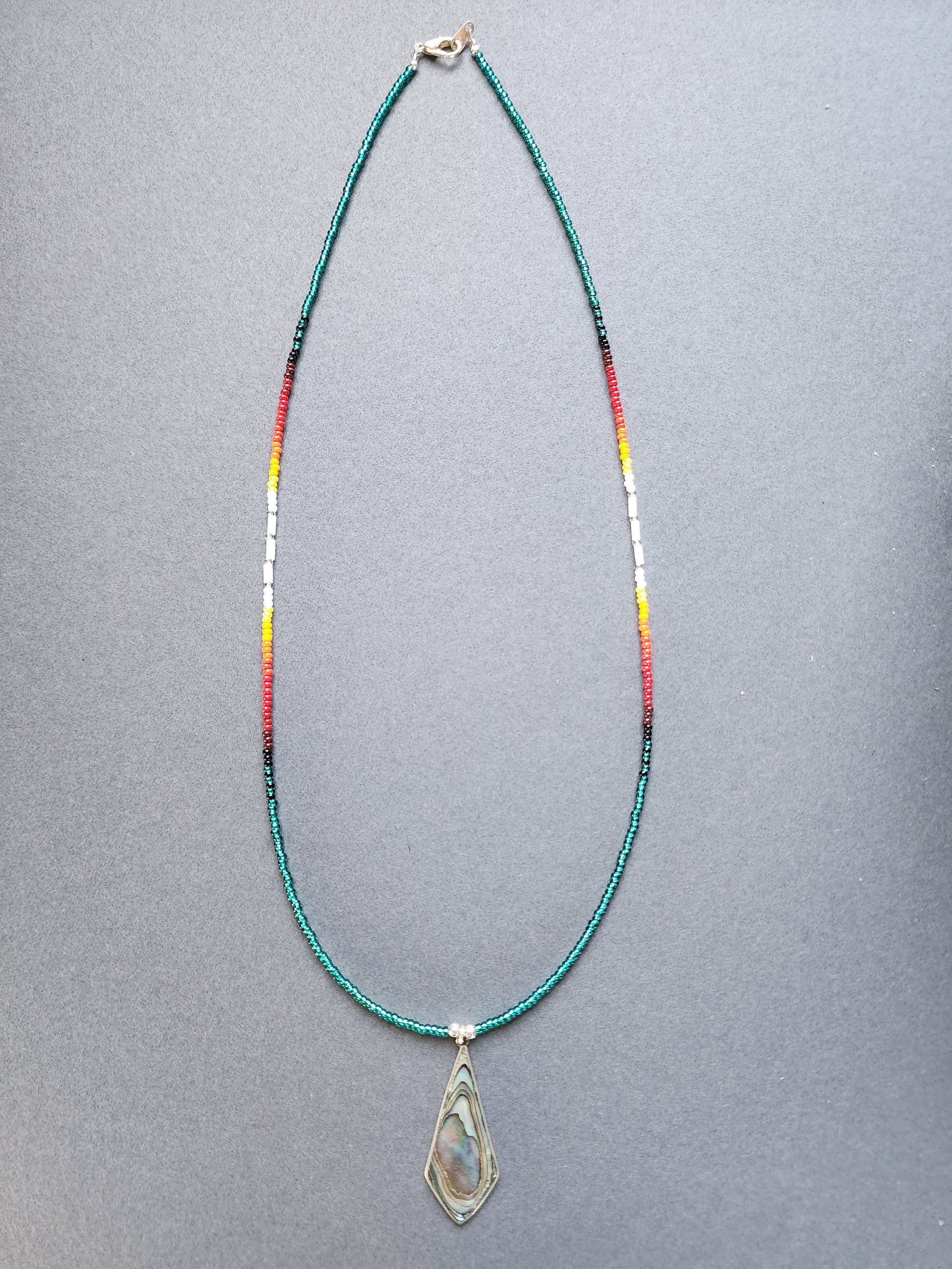 This beaded necklace is authentically handmade on the reservation by Native artist Angela Twiss. Each piece is carefully crafted bead by bead using a consistent, intentional design developed by Angela and made to order in your selected size.