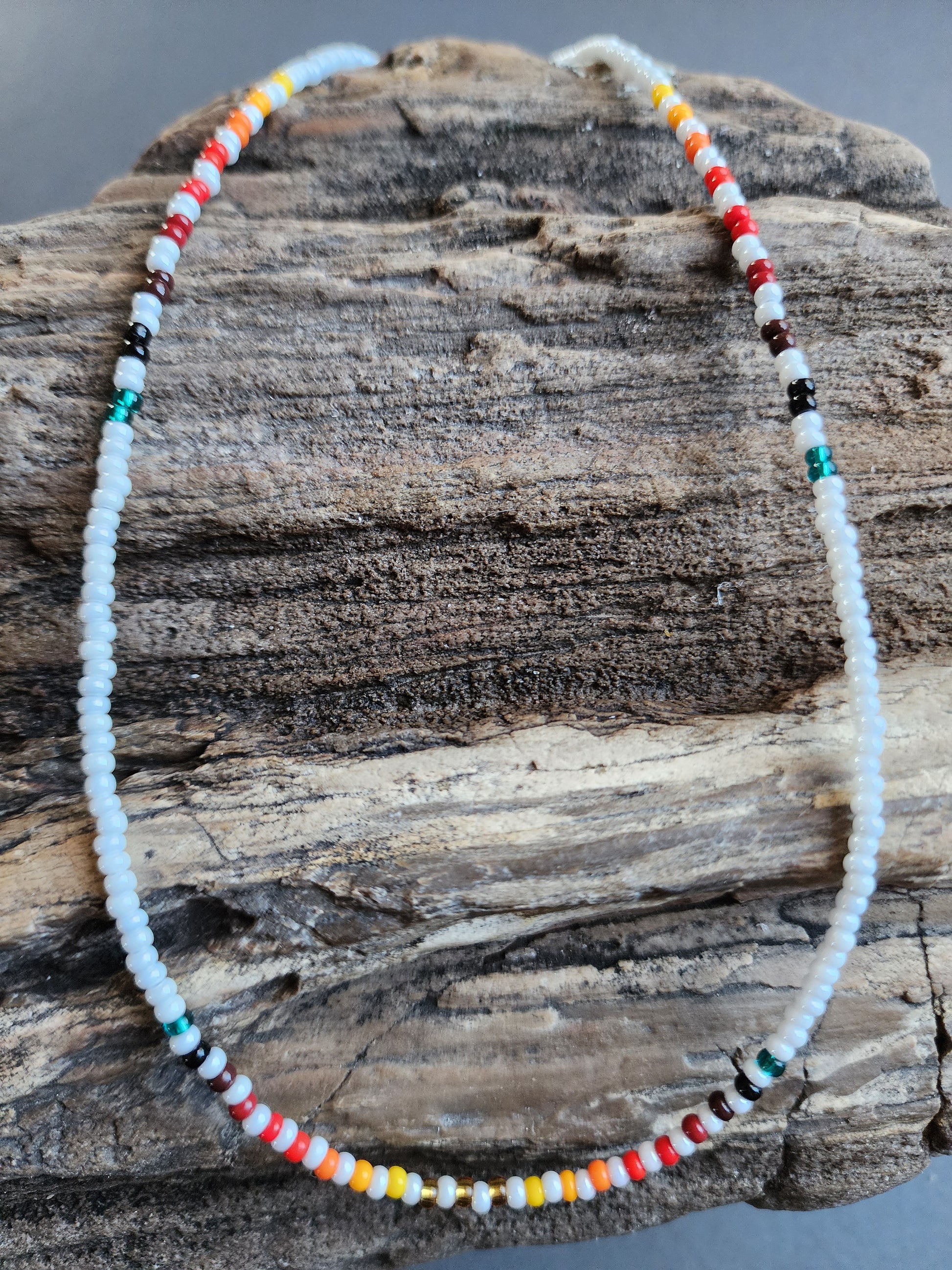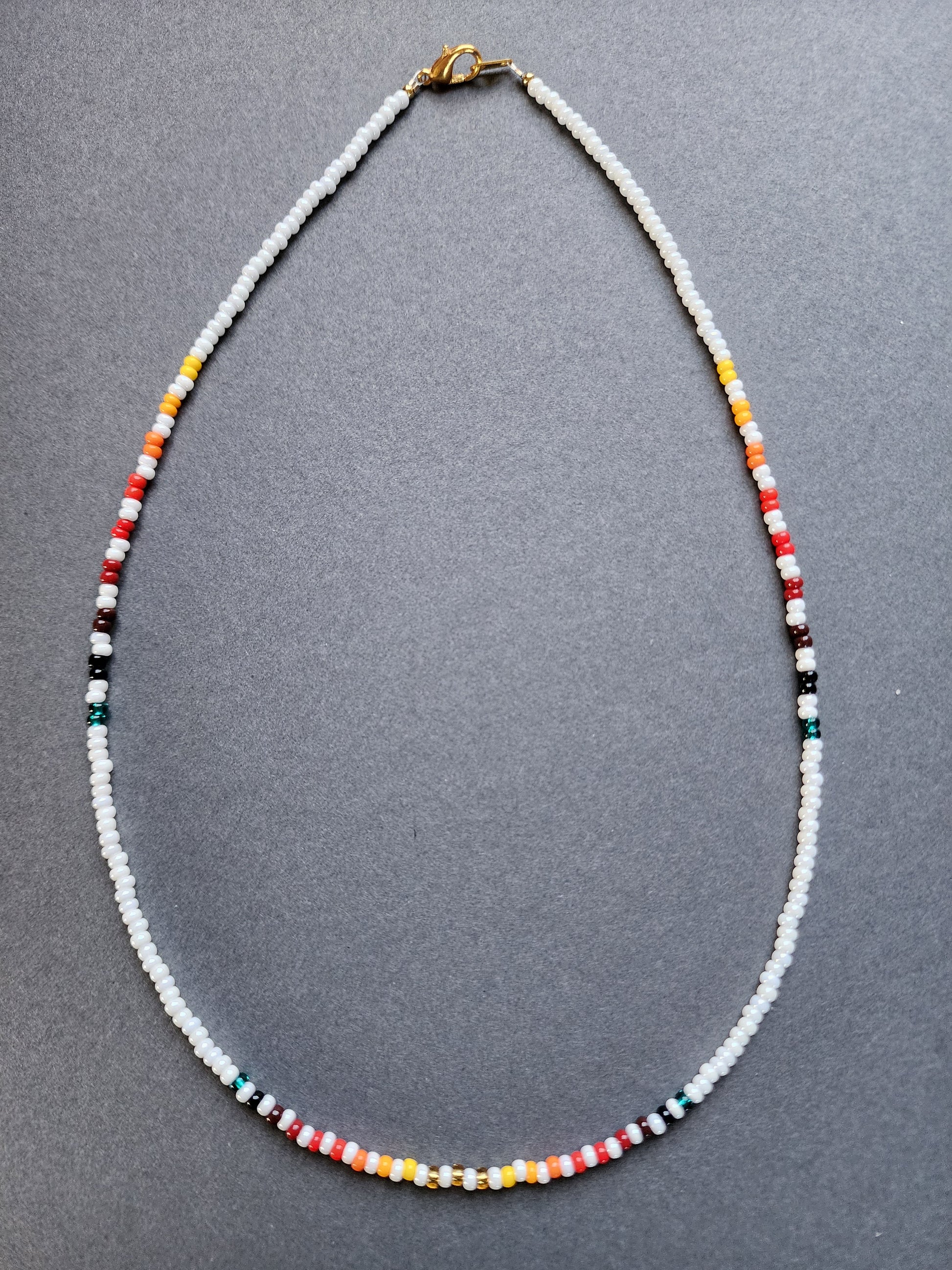 This beaded necklace is authentically handmade on the reservation by Native artist Angela Twiss. Each piece is carefully crafted bead by bead using a consistent, intentional design developed by Angela and made to order in your selected size.